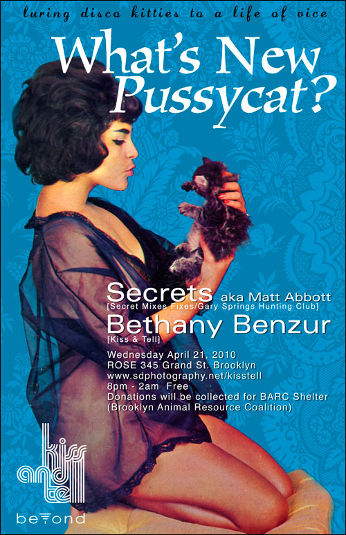 Matt Abbott, aka Secrets, is our special guest DJ this month. We met Matt at the No Way Back party in Detroit in 2008, and bonded over our mutual interest in psychedelic art and techno. Although Abbott is known for his techno tracks, it's his amazing sets of homemade disco edits that really appeal to the Kiss & Tell dancefloor. We were so impressed by his unique set last year at Kiss & Tell that we invited him back for this month's Pussycat party. 2010 is shaping up to be a great year for Secrets, with performances at WMC in March, DEMF in May, and a European tour this summer.