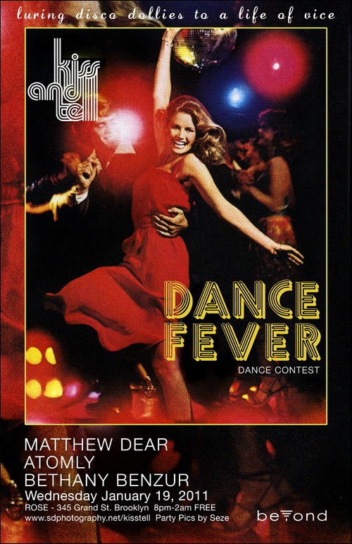 Kiss & Tell: Dance Fever In the 80s we obsessively watched what is now considered to be one of the worst dance shows in the history of TV, Dance Fever, which aired weekly from 1979 to 1987. Later, we thankfully got to experience Solid Gold and Soul Train on the air. In recent years, through the wonders of YouTube, we have been able to sneak a peek at The Scene and New Dance Show, the Detroit programs which featured way cooler music than anything on the national networks. For whatever reason, it was Dance Fever that really left an impression on our childhood ears and eyes. Maybe it was the C-list "celebrity" judges no one had ever heard of, or maybe it was the light-up dancefloor, we'll never really know. Broo Brooklyn local and international superstar Matthew Dear will be playing a sexy late night house music set. In honor of our buddy Atomly's birthday we are hosting a dance contest and letting him play all of his favorite songs. Atomly says: "I wanna be able to play Sugarloaf, Bananarama, Can, and Fad Gadget, but still be able to throw in Sabbath or Slayer if it feels right." He is also requesting that the ladies wear as little as possible. Resident DJ Bethany Benzur will be on decks with another one of her